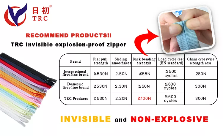 ซิปมองไม่เห็น TRC กันระเบิด (เทปลูกไม้) ให้ความต้านทานการฉีกขาดและการเลื่อนที่ราบรื่นเช่นเดียวกับเทปทั่วไป ในขณะที่ขอบแบบทอให้คุณภาพสัมผัสการตกแต่งที่ประณีต การผสมผสานงานฝีมือที่แม่นยำเข้ากับรายละเอียดเชิงศิลปะ เหมาะอย่างยิ่งสำหรับชุดเจ้าสาว ชุดเดรส โอต์กูตูร์ และคอลเลกชันแฟชั่นระดับพรีเมียม