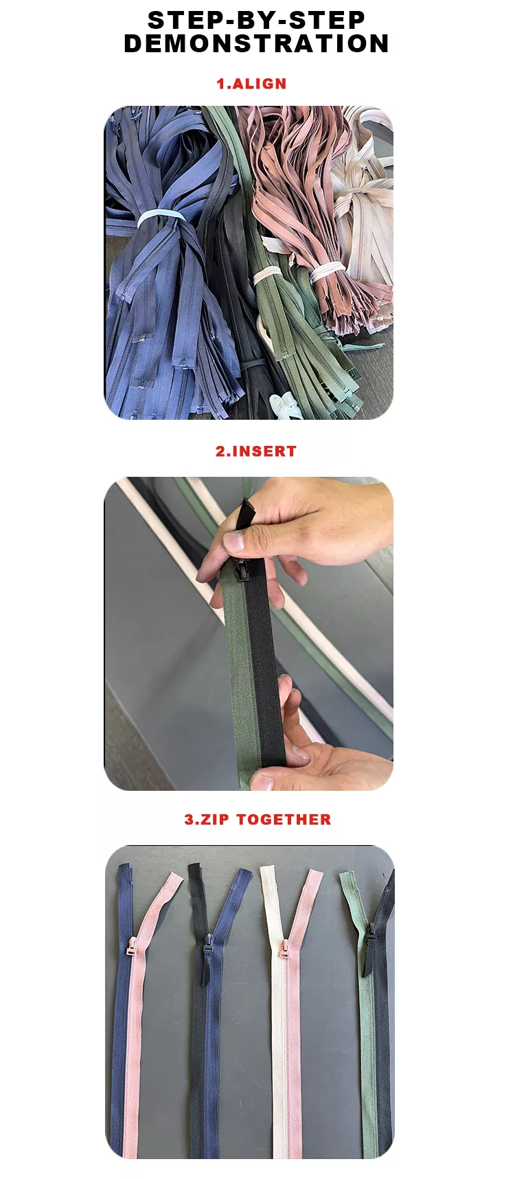 3. ซิปทั้งหมดของเราสามารถเชื่อมต่อได้อย่างราบรื่นโดยไม่คำนึงถึงสี ความยาว หรือชุดการผลิต